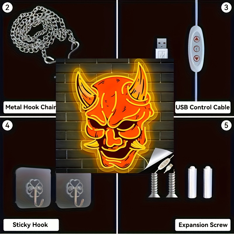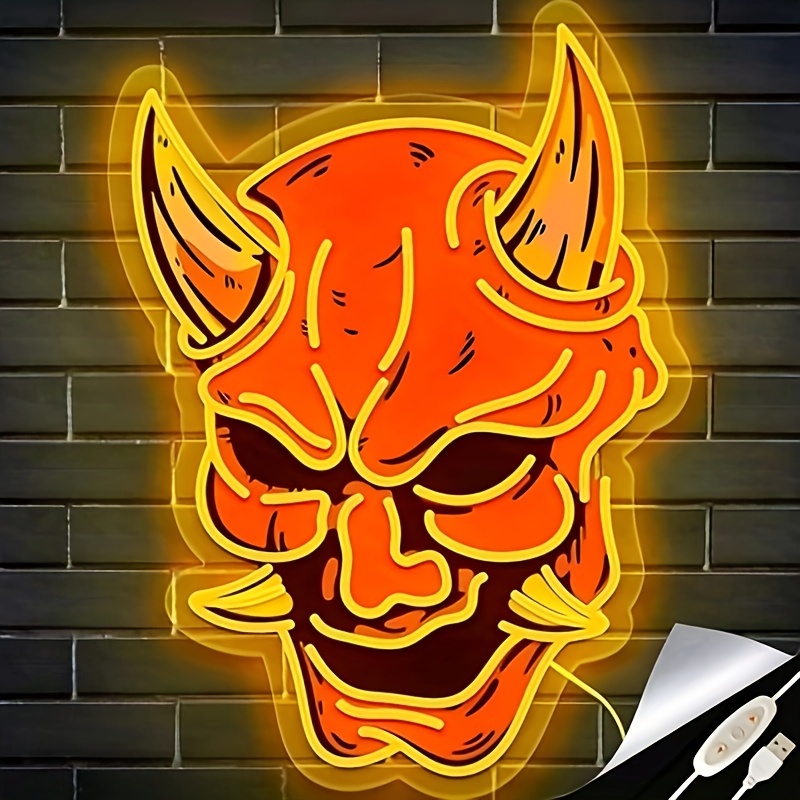 Hannya Demon LED Neon Sign, 1pc Yellow Japanese Noh Mask Wall Art, USB Powered with Push Button Control, Pre-Drilled for Easy Hanging, Versatile Decor for Gaming Room, Bar, Party - Non-Changeable Illumination
