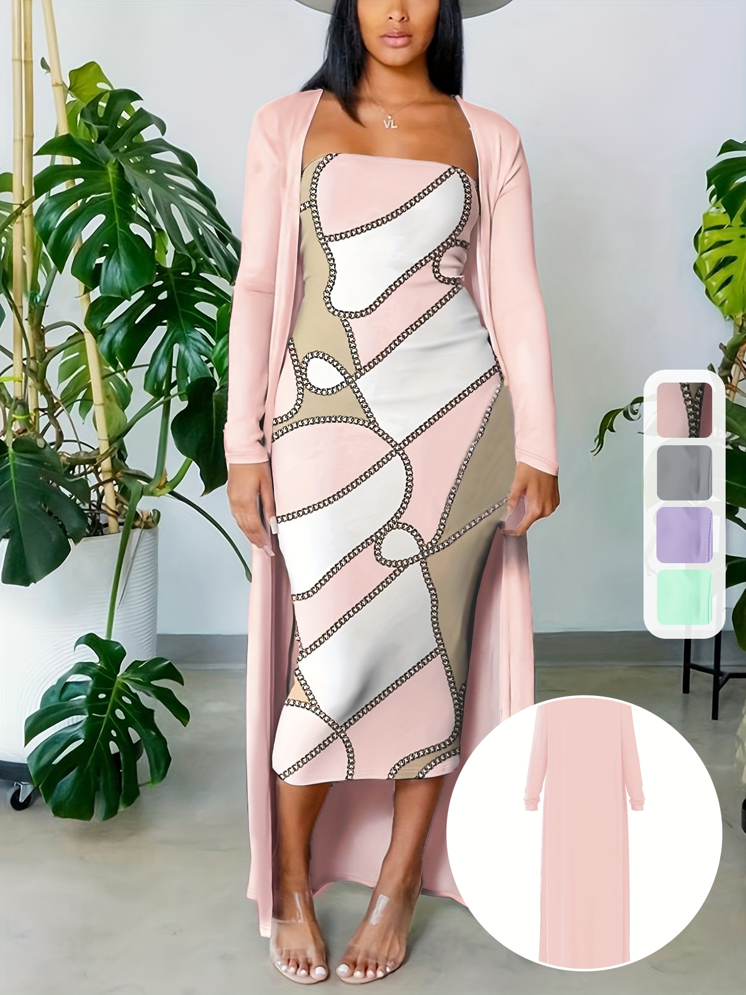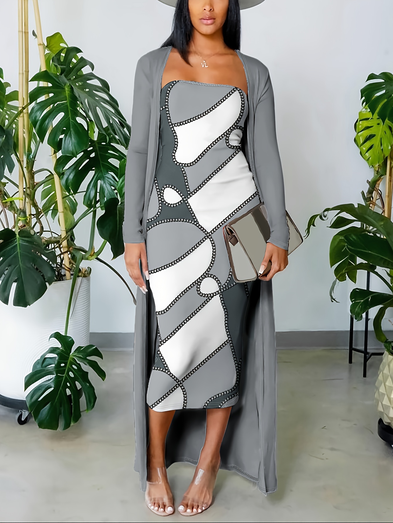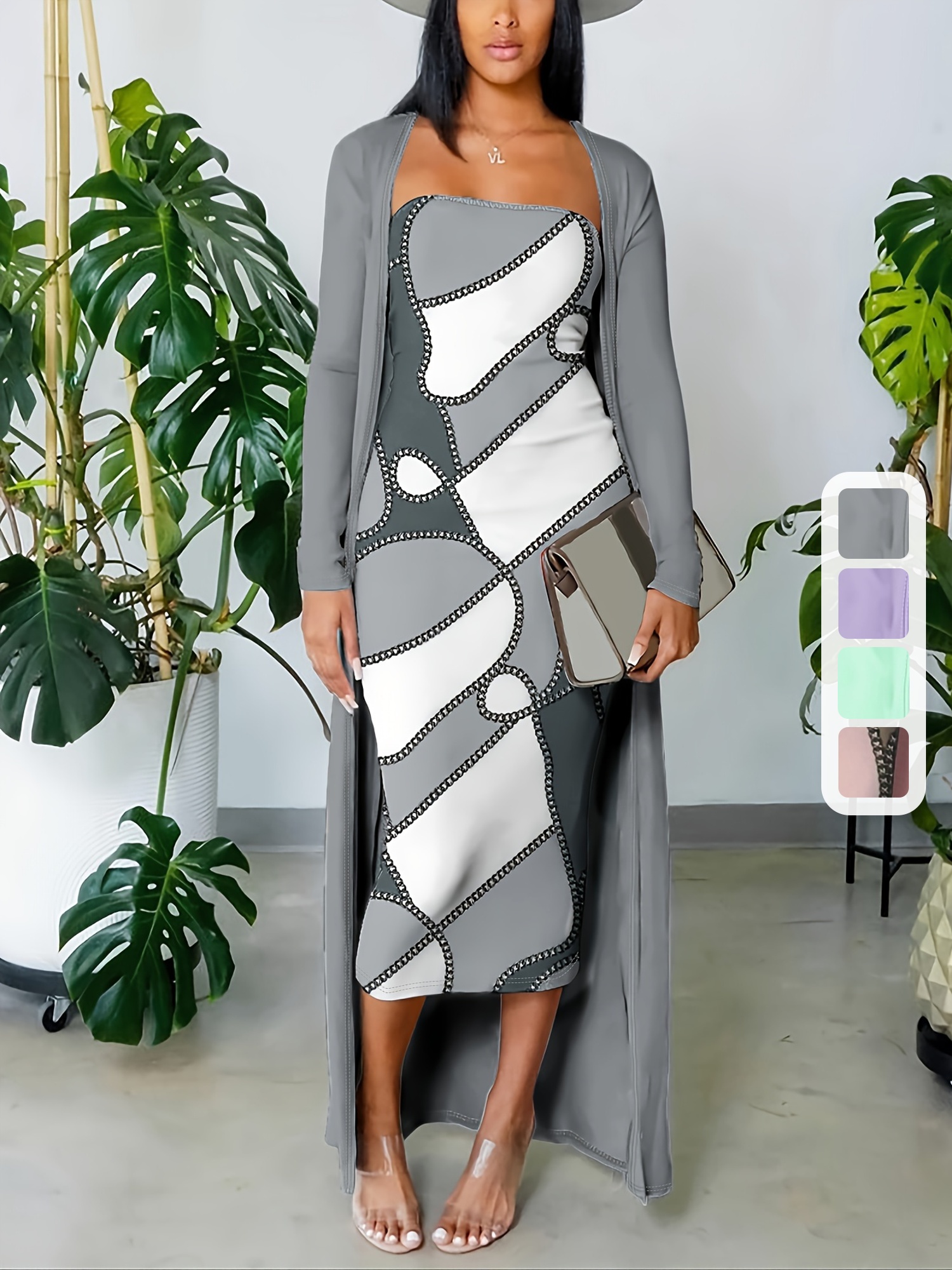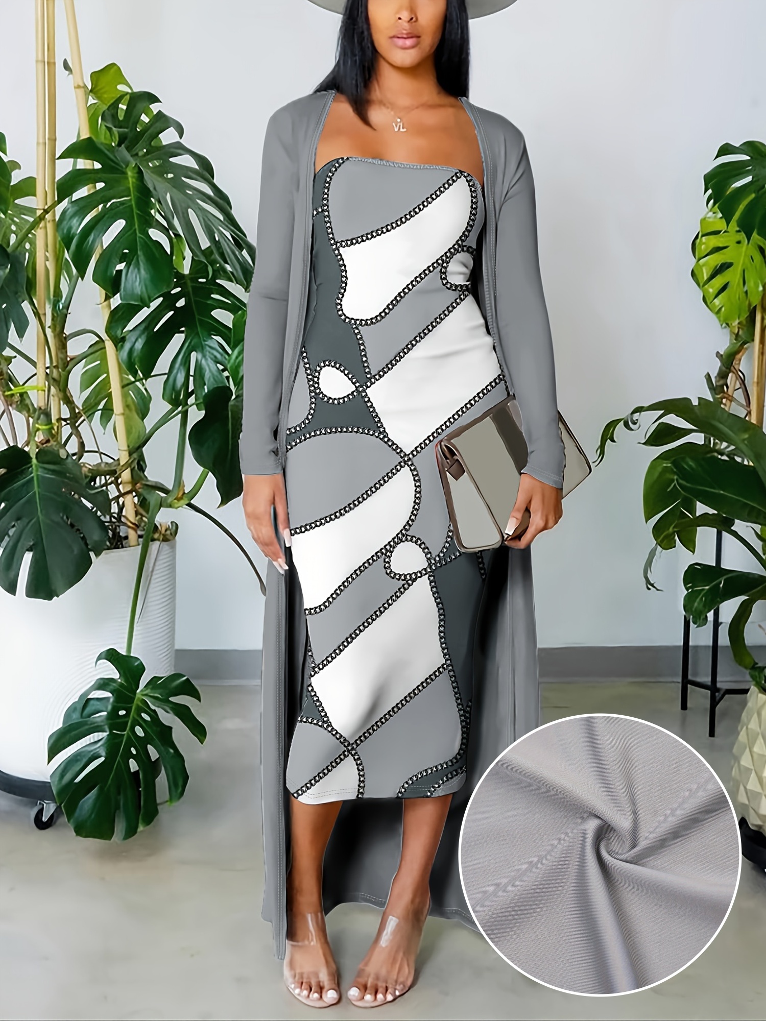 đ Robe bandeau Ă©lĂ©gante Ă motif gĂ©omĂ©trique (avec cardigan long)