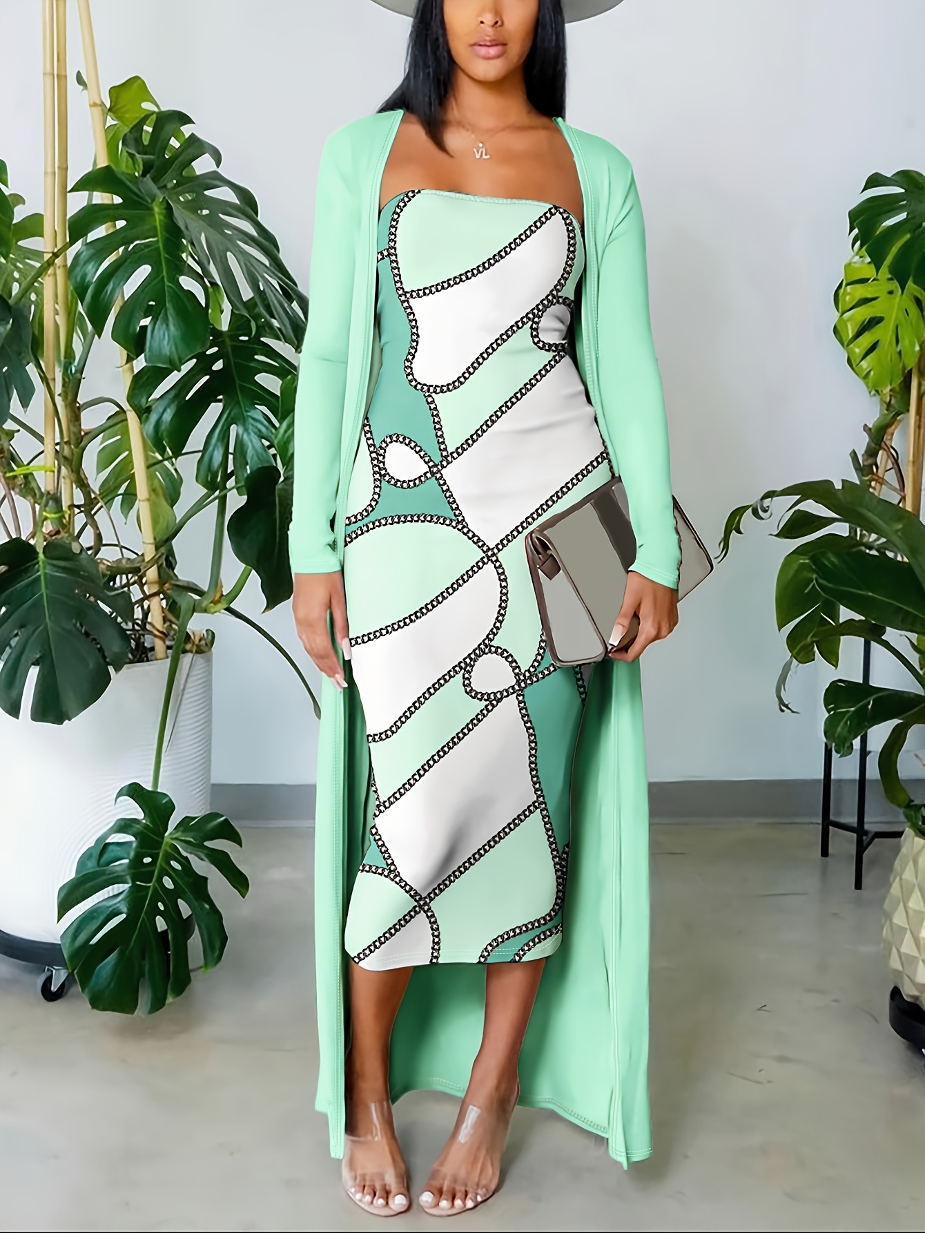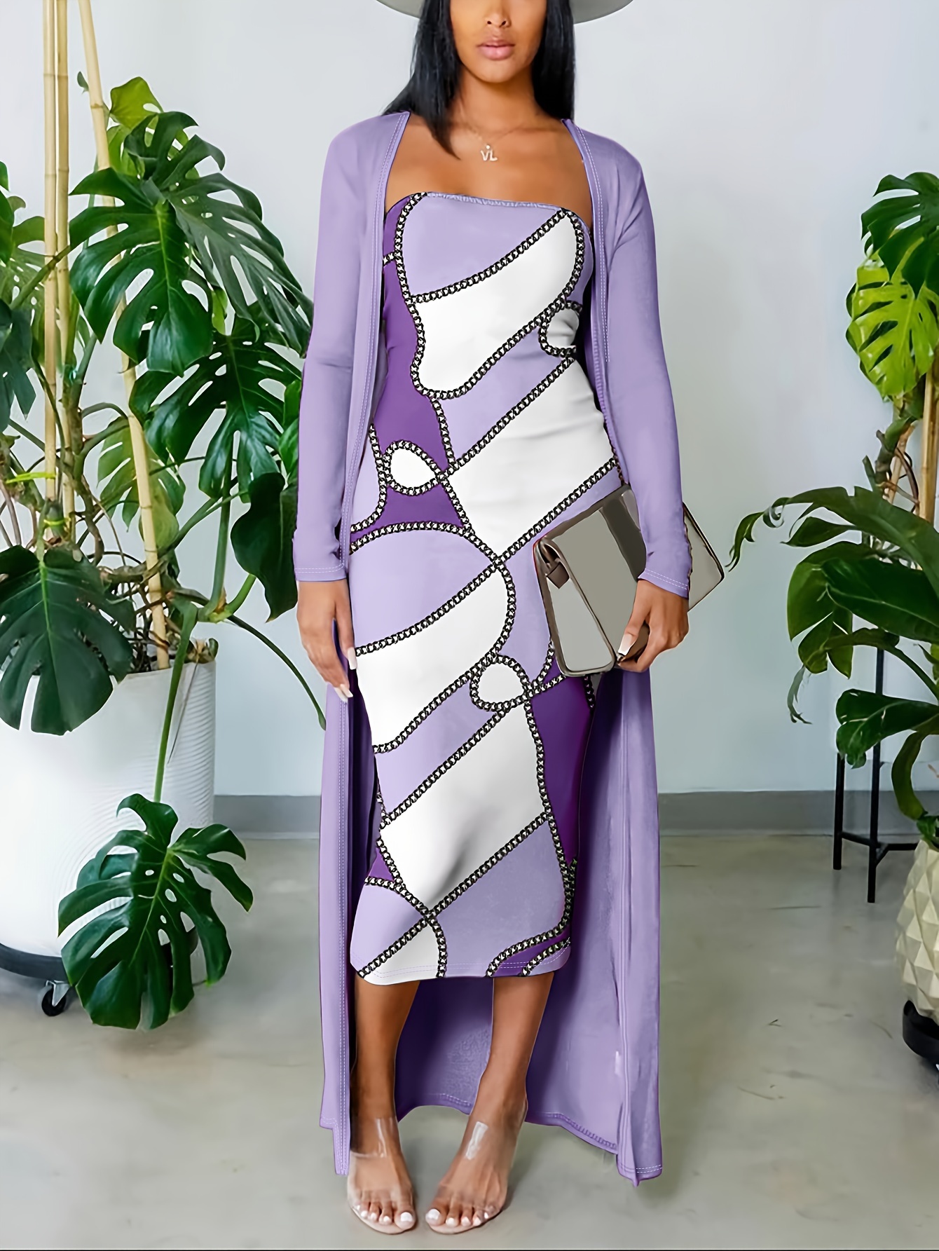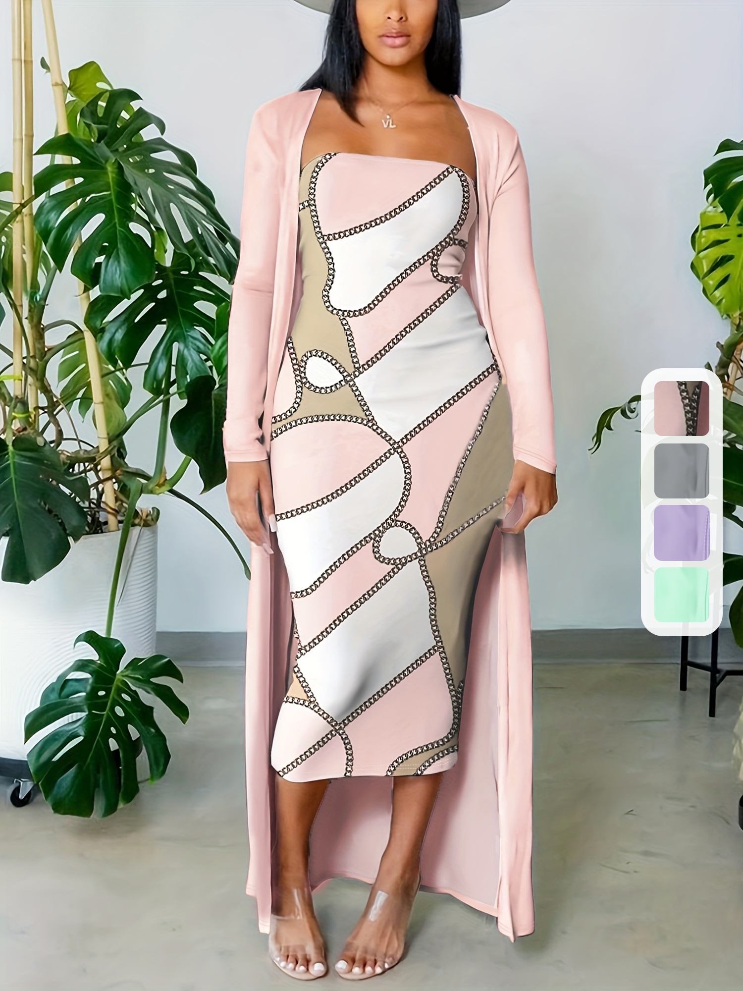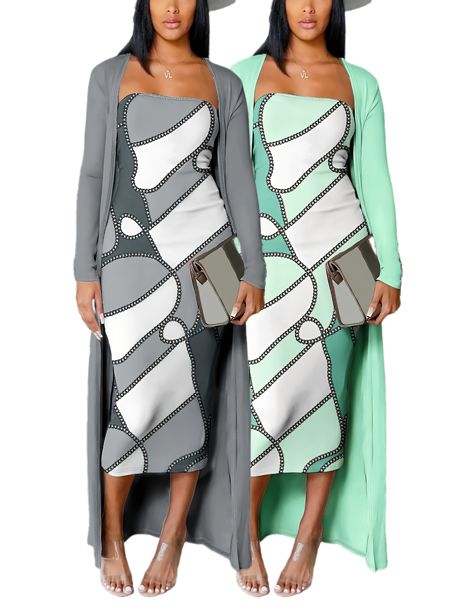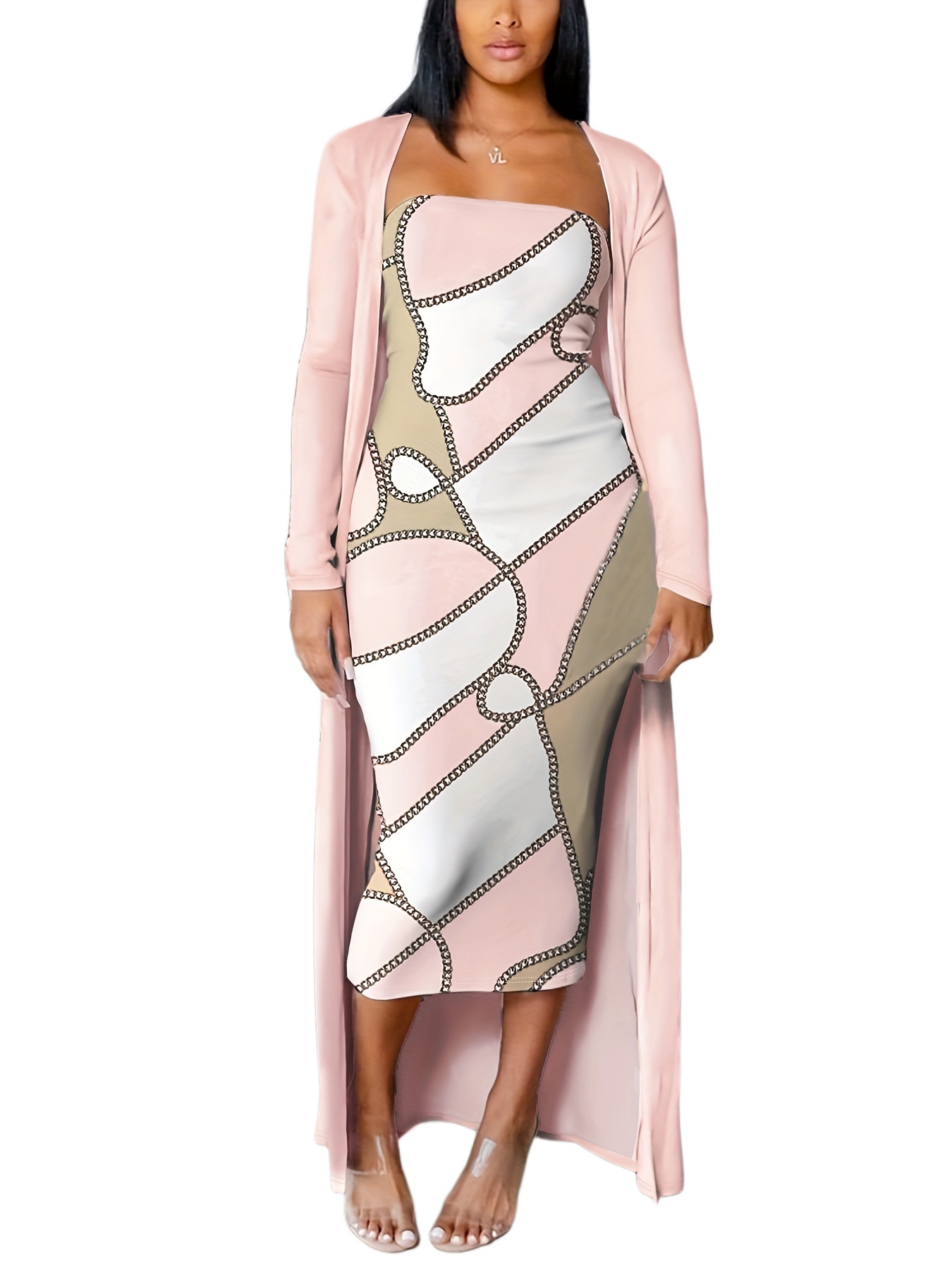 đ Robe bandeau Ă©lĂ©gante Ă motif gĂ©omĂ©trique (avec cardigan long)