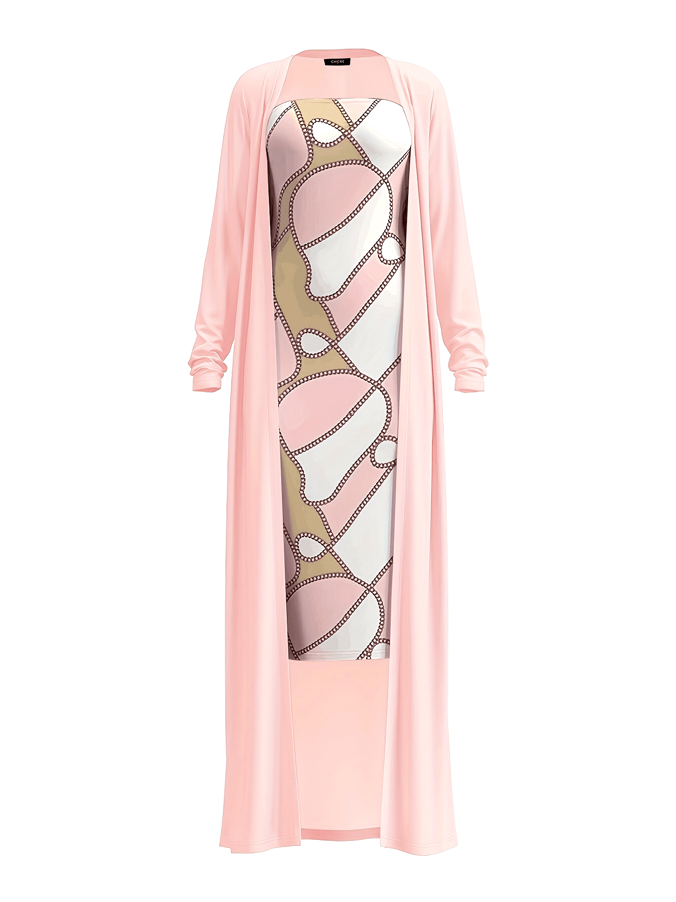 Cette robe midi bandeau au motif géométrique se distingue par son allure chic et moderne. Associée à son cardigan long assorti, elle offre une silhouette élancée et élégante, parfaite pour toutes les saisons.